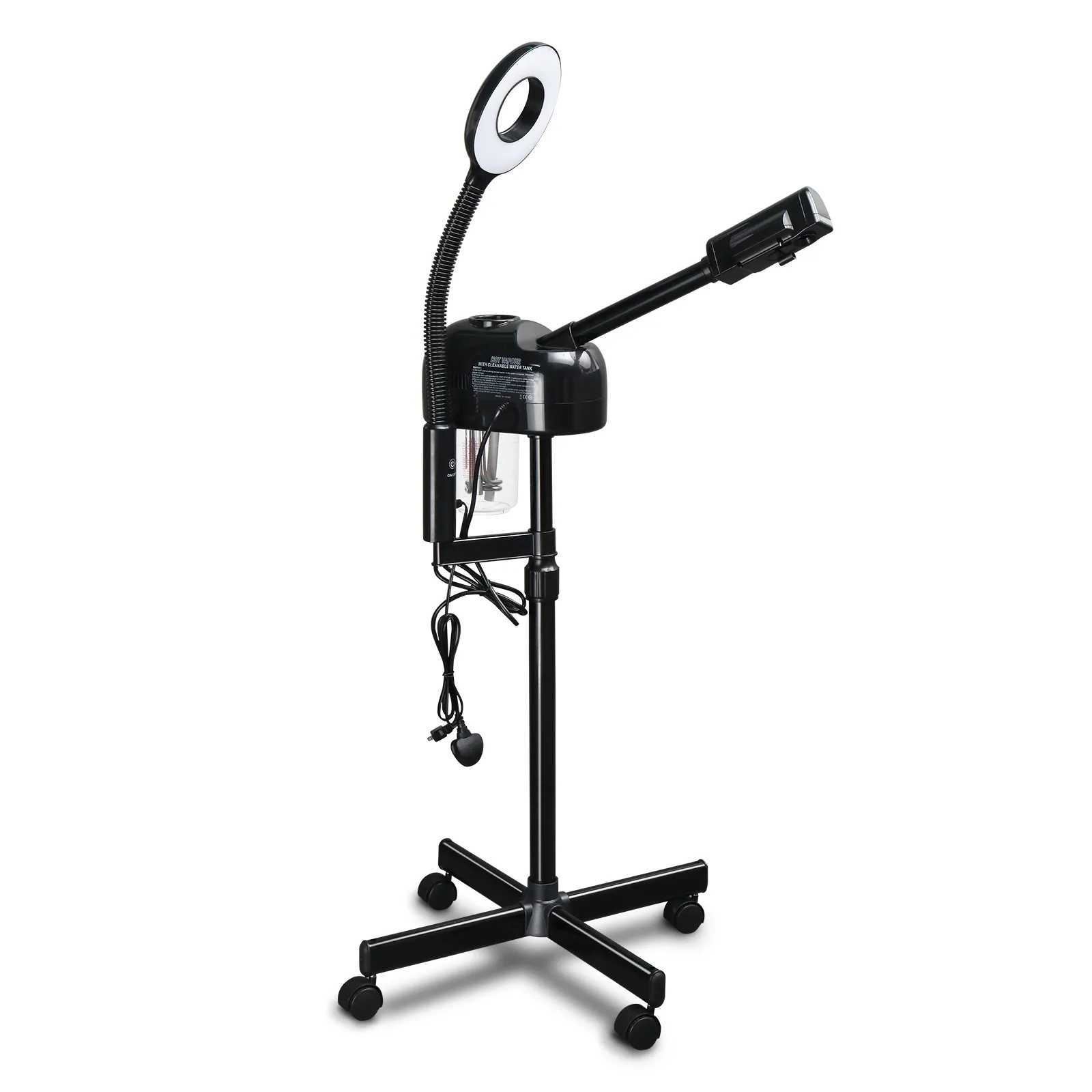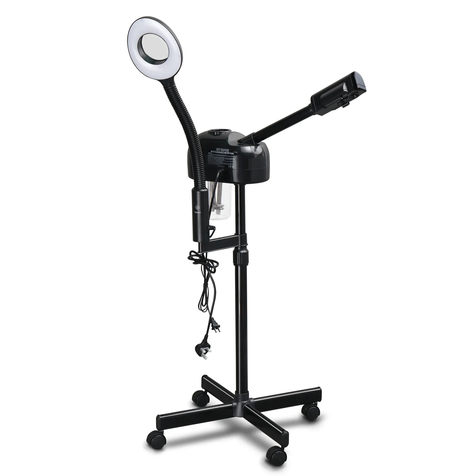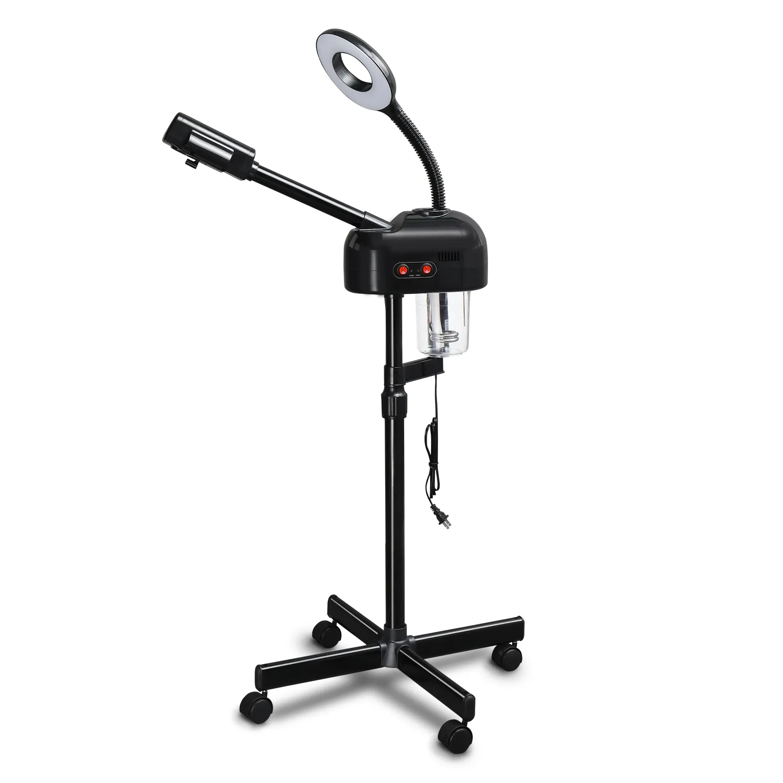The Facial Steamer is design for beauty salon or personal care use at home. Its sprayer has the function of ozone, so as to speed up skin nutrition absorption. And the ozone also can sterilize and whiten your skin, and improve blood circulation and metabolism. This sprayer also has the effect of moisturing, water replenishing and keep your skin moist. Height is adjustable , fit for shampoo chair or massage table. A great skin care device for barber shop / beauty salon. With four rolling casters, you can take it around house or studio with no effort.